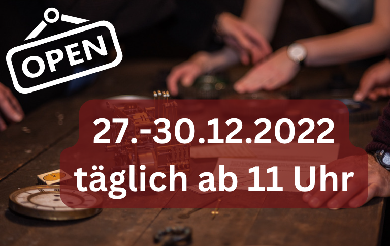 Stattdessen könnt ihr an den Tagen dazwischen - 27. bis 30.12.2022 - durchgehend von 11 bis 22 Uhr rätseln was das Zeug hält. Wir sind auch für spontane Buchungen verfügbar, meldet euch gerne bei uns!